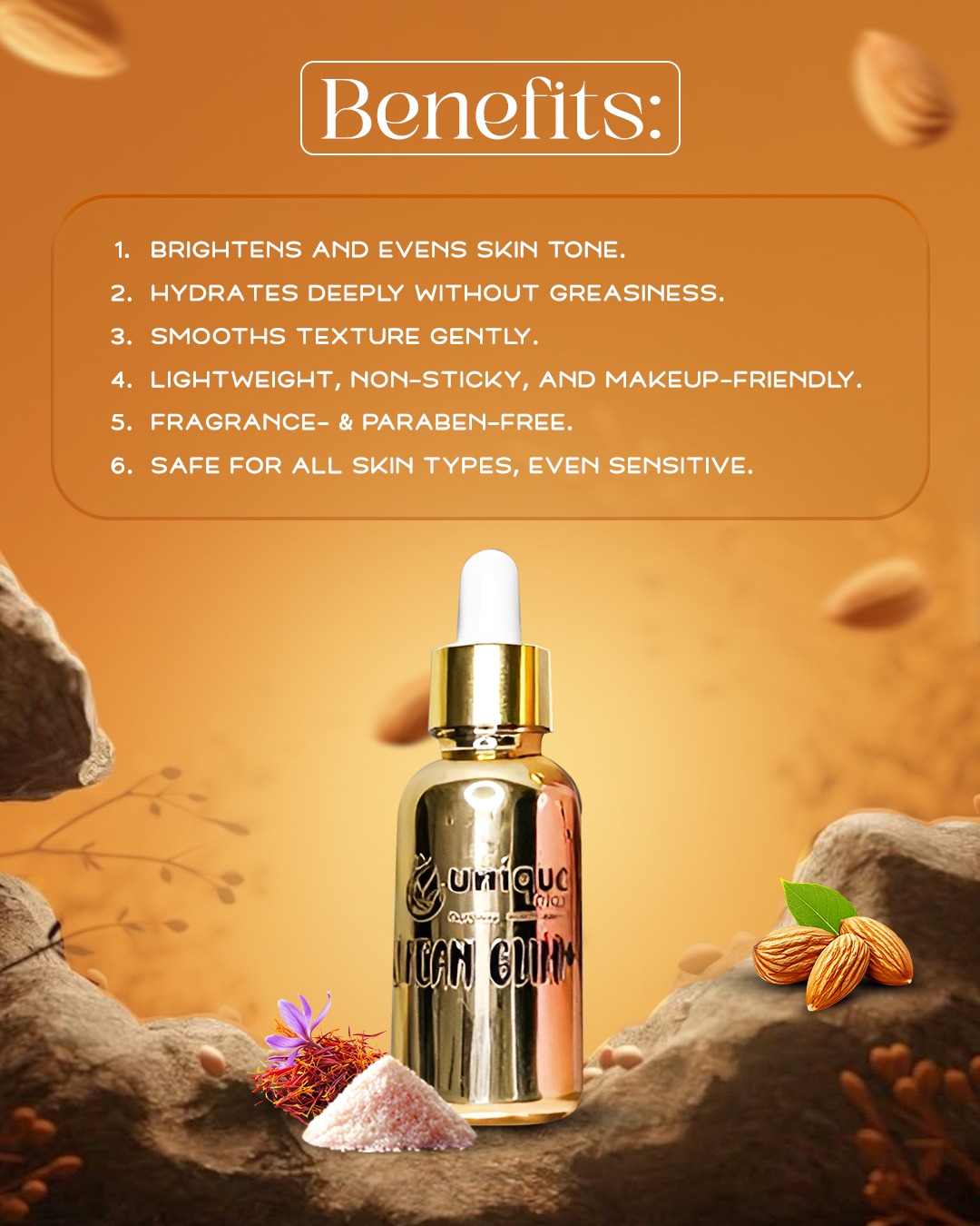 • 🌾 Rice Water + Saffron + Almond Extract: Brighten, nourish & even out tone